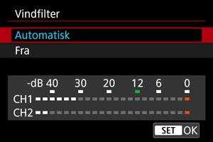 Indstil til [Automatisk] (eller [Til]) for at reducere lydforvrængningen ved udendørsscener med blæsevejr. Når vindfilterfunktionen træder i kraft, vil en del af lave baslyde også blive reduceret.