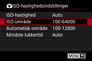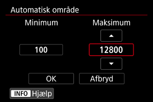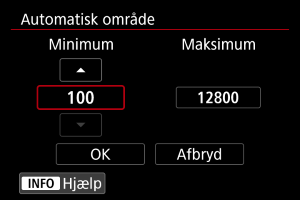 Du kan manuelt indstille ISO-område (minimum- og maksimumgrænser).