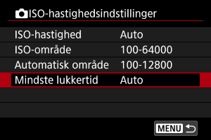 For automatisk at forhindre lukketider i at blive indstillet for lavt kan du indstille mindste lukkertid for ISO Auto.