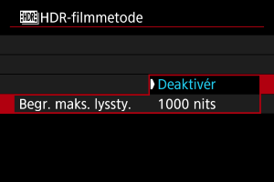 - Med [Deaktivér] er maksimumgrænsen for lysstyrke, ikke begrænset. Anbefales, når du vil vise billeder på en skærm, som understøtter visning ved en lysstyrke, som overstiger 1000 nits.