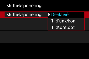 - Med [Kontinuerlig] fortsætter multieksponeringsoptagelsen, indtil du sætter indstillingen i trin 2 til [Deaktivér].
