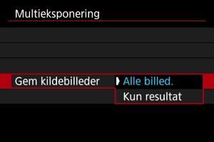 Med [Gem kildebilleder: Alle billed.] gemmes alle enkelte eksponeringer og det multieksponerede billede indtil nu, og multieksponeringsoptagelsen afsluttes. Med [Gem kildebilleder: Kun resultat] gemmes kun det multieksponerede billede indtil nu, og multieksponeringsoptagelsen afsluttes. |