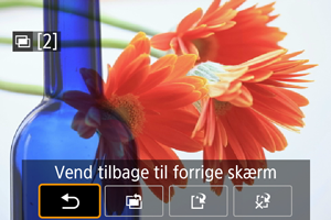 Hvis du vil vise det multieksponerede billede indtil nu, skal du tjekke eksponeringen og se, hvordan billederne er flettet sammen. Du kan trykke på knappen , før du er færdig med at optage dit angivne antal eksponeringer (når [Til:Funk/kon] er indstillet, men ikke med [Til:Kont.opt]).