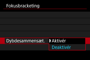 - Vælg [Deaktivér], hvis du foretrækker ikke at kompensere for ændringer i billedlysstyrken i forbindelse med fokusbracketing. Brug denne indstilling til andre formål end dybdekomposition af optagede billeder i programmer som f.eks. Digital Photo Professional ().