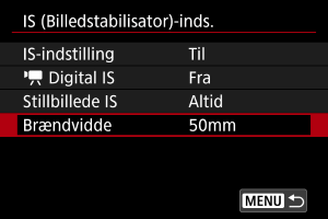 Billedstabilisering, der er baseret på dit angivne objektivs brændvidde, er muligt ved at indstille brændvidden, når du bruger objektiver, der ikke understøtter objektivkommunikation.