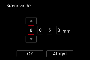 - Brændvidde kan indstilles i intervallet mellem 1-1000 mm (i trin på 1 mm).