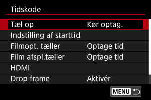 Hvis du vil konfigurere tidskoden, skal du bruge [: Tidskode].