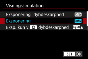 Med skærmsimulation kommer billedlysstyrken og dybdeskarpheden tættere på den faktiske lysstyrke (eksponering) på dine optagelser.