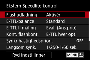 - Funktioner er begrænset ved brug af Speedlites i EX-serien, der ikke er kompatible med flashindstillinger.