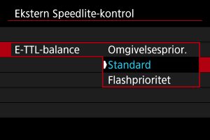 Du kan indstille dit foretrukne udseende (balance) for flashoptagelser. Denne indstilling gør det muligt at justere forholdet af det omgivende lys i forhold til Speedlite-lysoutputtet.