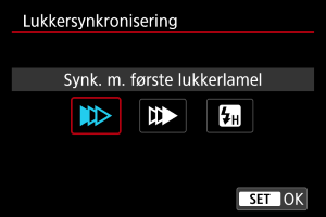 Normalt indstilles dette til [Synk. m. første lukkerlamel], så flashen straks udløses, når optagelsen starter.