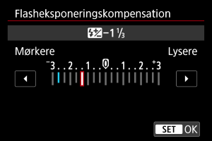 - Hvis flasheksponeringskompensation indstilles med Speedliten, kan du ikke indstille flasheksponeringskompensation med kameraet. Hvis den indstilles med både kameraet og Speedliten, tilsidesætter Speedlitens indstillinger kameraets.