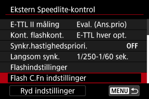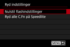 - Vælg [Nulstil flashindstillinger] eller [Ryd alle C.Fn på Speedlite].