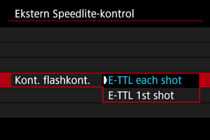 - Indstil til [E-TTL 1. opt.] for kun at udføre flashmåling for den første optagelse før kontinuerlig optagelse. Flashoutputniveauet for den første optagelse anvendes på alle efterfølgende optagelser. Dette er nyttigt, når du prioriterer kontinuerlig optagelseshastighed uden at komponere optagelserne på ny.
