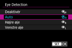 Du kan optage, så motivets øjne er i fokus ved at indstille [: Eye Detection] til en anden indstilling end [Deaktivér] ().