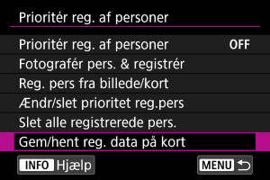 - For at indlæse registrerede data fra kortet og overskrive eksisterende data på kameraet skal du vælge [Indlæs fra kort (overskriv)]. Alle eksisterende registrerede data på kameraet slettes.