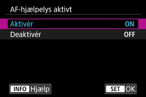 Deaktiverer affyring af AF-hjælpelyset. Indstil den, hvis du foretrækker ikke at affyre AF-hjælpelyset.