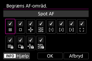 Du kan begrænse de AF-områder, der er tilgængelige for det område, du vil bruge. Vælg AF-områder, og tryk på for at tilføje et flueben [