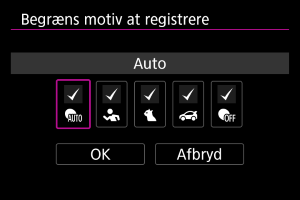 Du kan begrænse de tilgængelige indstillingsmuligheder i [: Motiv til regist.] til dine foretrukne indstillinger. Vælg en indstilling, der skal udelukkes, og tryk på