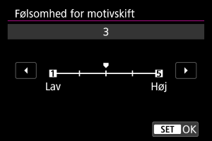 Du kan indstille, hvor let fokus skifter, hvis der registreres et nyt motiv under filmoptagelse. Jo højere værdien er, jo lettere er det at skifte motiv.