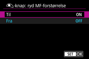Hvis du indstiller denne funktion til [Til], kan du annullere forstørret visning ved at trykke udløserknappen halvt ned, når du tager stillbilleder i MF-fokusfunktion.