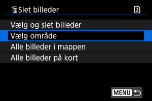 Når du ser på billederne i indeksvisningen, kan du angive det første og sidste billede for et område for at slette alle de angivne billeder på én gang.