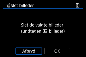 Du kan enten vælge og slette billeder, du ikke behøver, et for et eller slette dem samlet. Beskyttede billeder () bliver ikke slettet.