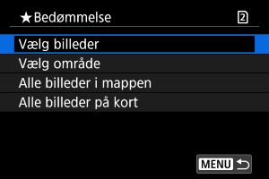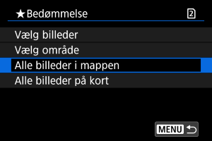 : Bedømmelse] vælger [Alle billeder i mappen] eller [Alle billeder på kort], bedømmes alle billederne i mappen eller på kortet.