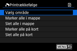 Vælg [Marker alle i mappe], og vælg mappen. Der angives en printrækkefølge for én kopi af alle billederne i mappen.