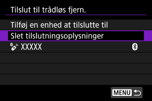 Du kan slette forbindelsesoplysningerne. Dette annullerer parringen for alle tilsluttede trådløse fjernbetjeninger.