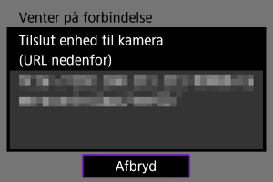 - Når ovenstående skærm vises på kameraet, skal du bruge din smartphone, computer eller anden enhed til at få adgang til den angivne URL fra den applikation, der er udviklet til kamerakontrol.