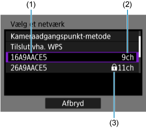 - Et tomt felt i (2) angiver, at der er fundet flere SSID'er med samme navn. Hvis du vælger et SSID, hvor (2) er tomt, opretter kameraet forbindelse til det adgangspunkt blandt disse, der har det stærkeste signal.