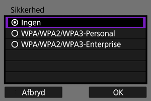 - Den samme sikkerhedstype skal indstilles på både den anden enhed og kameraet. Se Metoder til godkendelse og datakryptering for detaljer om typer af godkendelse og kryptering.