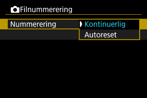 Bemærk, at filnummerering kan fortsætte fra eventuelle eksisterende billeder på kort eller i mapper, du skifter til. Hvis du vil anvende kontinuerlig filnummerering, anbefales det, at du anvender et nyligt formateret kort hver gang.