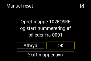 Når du nulstiller filnummereringen manuelt, oprettes automatisk en ny mappe, og filnummereringen af billeder gemt i den mappe, begynder fra 0001.
