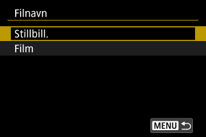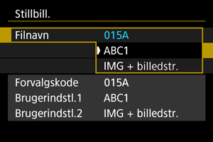 Filnavne består af alfanumeriske tegn efterfulgt af et filnummer på fire cifre () og filtypenavn. Du kan ændre de første fire alfanumeriske tegn, der som standard er unikke for hvert kamera og blev indstillet, da kameraet blev afsendt.