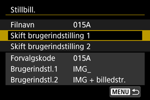 Brugerindstilling 1 gør det muligt at registrere fire tegn efter eget valg. Brugerindstilling 2 føjer tre indledende, registrerede tegn efter eget valg til et fjerde tegn, der repræsenterer billedstørrelsen, der tilføjes automatisk, når du har optaget.