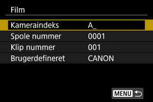 Et 3-cifret nummer fra 001 til 999 med C foran, som i C001-C999. Efter C999 bruges D i begyndelsen. Tildeles automatisk til hvert klip (filmfil). Du kan indstille standardværdien. |