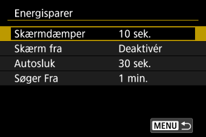 • [Skærmdæmper] og [Skærm fra] anvendes, når optagelsesskærmen vises. Disse indstillinger anvendes ikke i menuvisning eller billedafspilning.