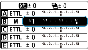 Wenn Sie eine EOS-DIGITAL-Kamera verwenden, die 2012 oder später auf den Markt gekommen ist, können Sie für jede Blitzgruppe einen anderen Blitzmodus einstellen. Bis zu fünf Gruppen sind möglich (A, B, C, D und E).