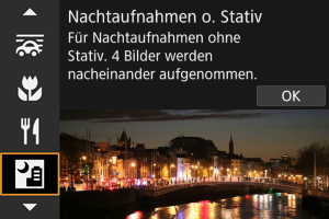 Der Modus [] (Nachtaufnahmen o. Stativ) ermöglicht, Nachtaufnahmen aus freier Hand zu machen. In diesem Aufnahmemodus werden für jedes Bild nacheinander vier Aufnahmen erstellt, die dann zu einem Bild zusammengefügt werden. So entsteht ein Bild mit reduzierter Verwacklung.