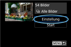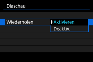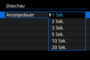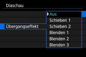 - Legen Sie die Einstellungen [Anzeigedauer], [Wiederholen] (wiederholte Wiedergabe) und [Übergangseffekt] (Effekt beim Bildwechsel) für die Einzelbilder fest.