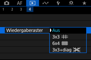 Sie können ein Gitter über Einzelbilder in der Einzelbildanzeige auf dem Wiedergabebildschirm anzeigen lassen. Mit dieser Funktion können Sie auf einfache Weise die vertikale oder horizontale Neigung des Bildes und die Bildkomposition überprüfen.