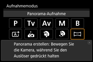 Das Panorama entsteht durch die Kombination von Aufnahmen, die bei Reihenaufnahmen gemacht wurden, wenn Sie die Kamera in eine Richtung bewegen und dabei den Auslöser ganz gedrückt halten.