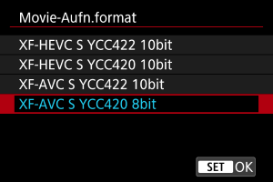 XF-HEVC S- und XF-AVC S-Movies haben das originale Canon-Videoformat, die Erweiterungen von H.265/HEVC bzw. MPEG-4 AVC/H.264 sind. Bei diesen Formaten bleibt die Bildqualität erhalten, während sie gleichzeitig eine hohe Datenkompression bieten.