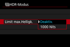 - Bei [Deaktiv.] ist die maximale Helligkeit nicht begrenzt. Empfohlen, wenn Sie Bilder auf einem Monitor überprüfen, der die Anzeige bei Helligkeiten über 1000 Nits unterstützt.