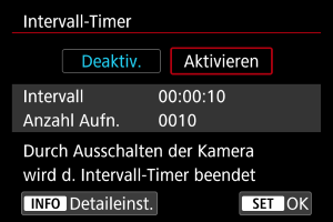 - Um Aufnahmen mit Intervalltimer zu beenden, wählen Sie [Deaktiv.] oder stellen Sie den Hauptschalter auf