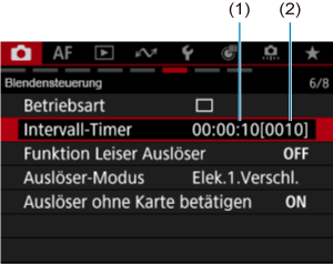 Mit dem Intervall-Timer können Sie das Aufnahmeintervall und die Anzahl der Aufnahmen festlegen, sodass die Kamera so lange wiederholt Einzelaufnahmen gemäß dem definierten Intervall erstellt, bis die von Ihnen angegebene Anzahl der Aufnahmen erreicht wurde.