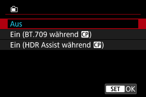 HDR-Aufnahme (PQ)] oder bei Aufnahmen mit benutzerdefinierten Bildern (), die auf dem Kamerabildschirm, dem Sucher oder über HDMI angeschlossenen Nicht-HDR-Anzeigegeräten angezeigt werden, kann dem Erscheinungsbild auf HDR-Anzeigegeräten angepasst werden.