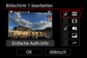 Sie können die bei Aufnahmen angezeigten Details und Informationsbildschirme auf der Kamera anpassen.